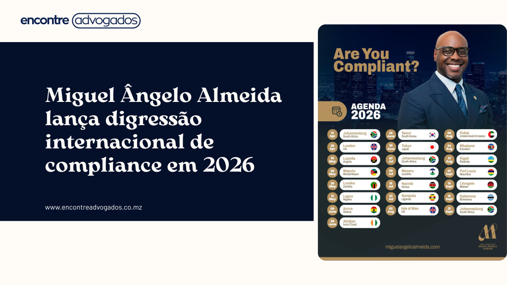 O advogado e especialista em compliance Miguel Ângelo Almeida inicia a sua digressão internacional 2026, com uma agenda que inclui conferências, palestras, workshops e sessões formativas em várias cidades de África, Europa, Ásia e Médio Oriente.